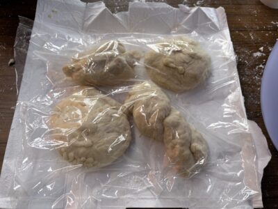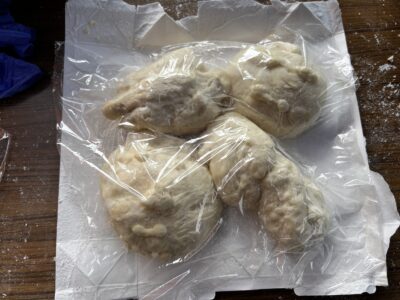 ちょうど良い固さをにするため、強力粉を追加し、丸めていきます。