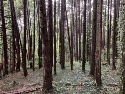 間伐が遅れて暗くなった森。細くなった木々が枯れていく。