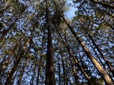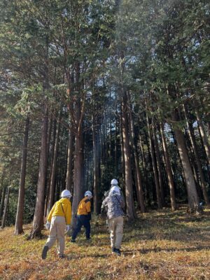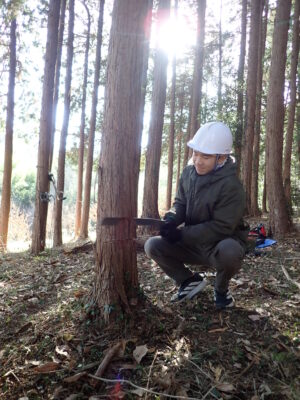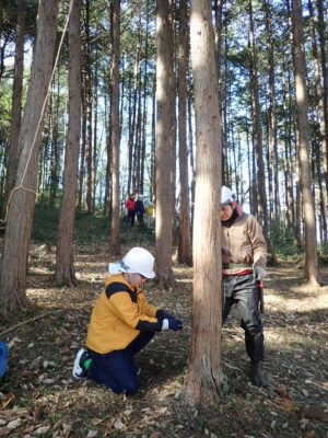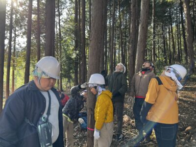 今回伐採した木はヒノキの人工林の木です。過密に植えた木々が育ち、大きくなって隣同士が近づき、混み合ってきます。それを放置すると木々が弱まり、根っこも弱まり、森自体が弱くなります。