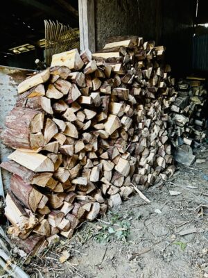 薪を作るためには、木を切り、木を運び、玉切りし、薪割りしてようやく薪ができます。薪はすぐ使うことができず、水分を抜くために1年間乾かします。