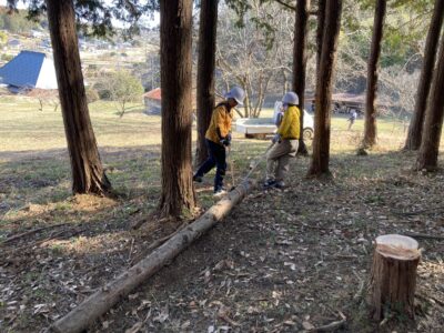 玉切りした材を運びます。切り立てで重いので仲間と協力して運びます。