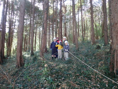 切る木はこのヒノキ!どこに向かって倒そうかと、みんなで考えます。