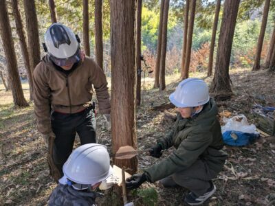 受け口(木を切るために三角の切り込み)を作ります。1人で切り続けるのは大変なのでみんなで協力して切っていきます。
